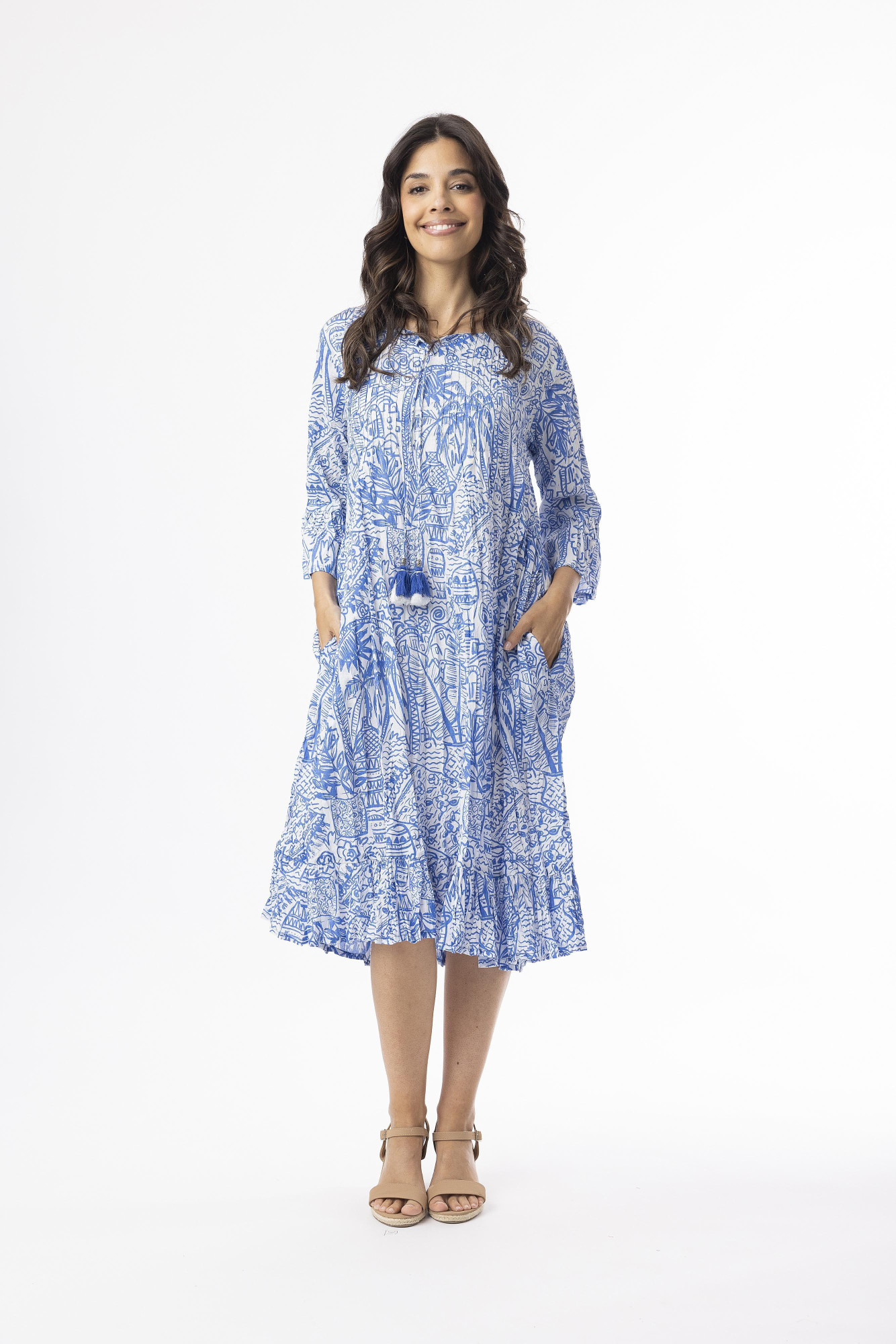 Aksharay Blue Dress Pinch Pleat Frill Sleeve Blue