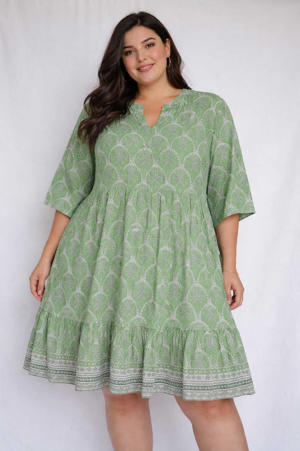 Beth Dress Pleated Drop Waist Palm Border Lime