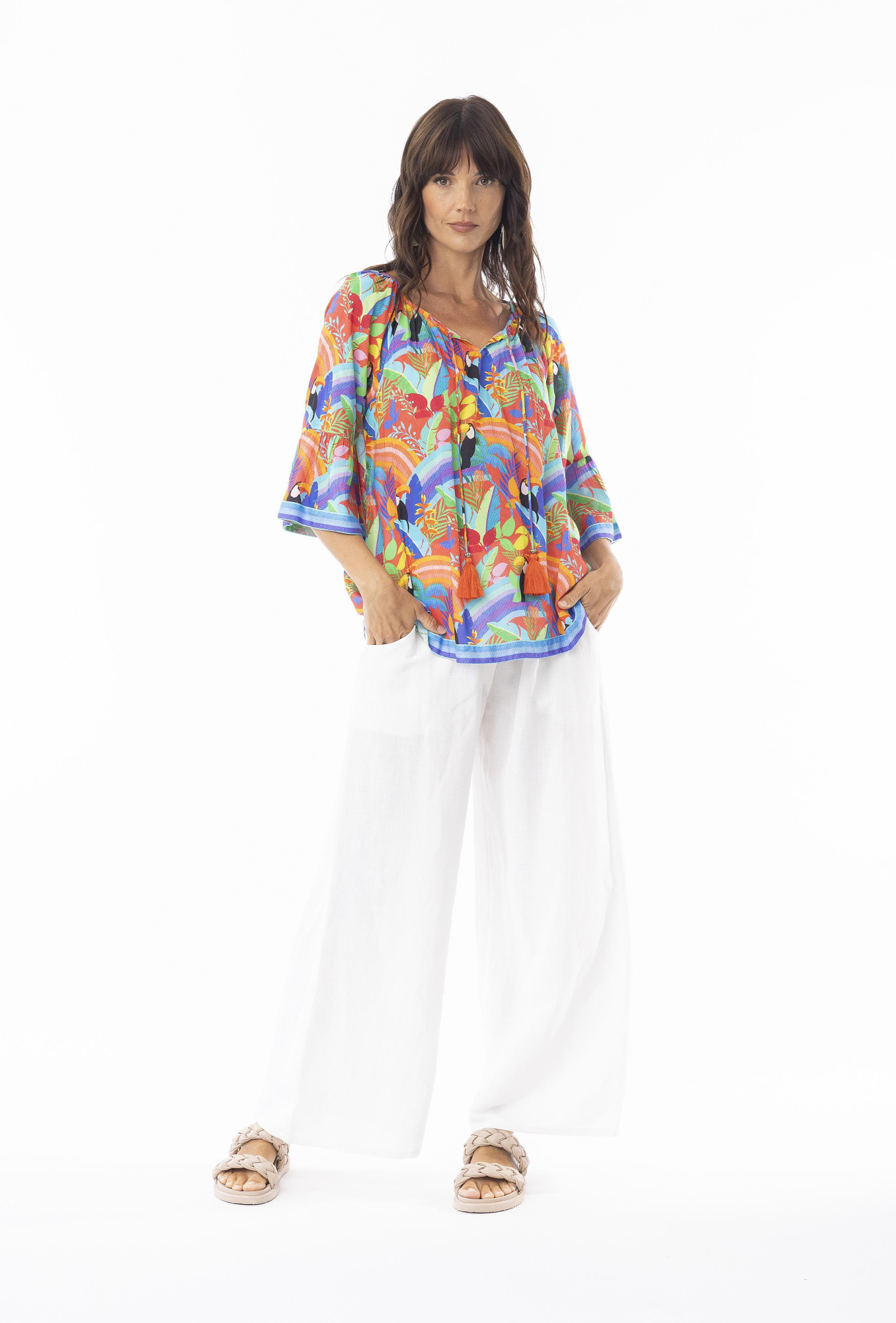Linen Solid Top Gather Neck 3/4 slv Sand